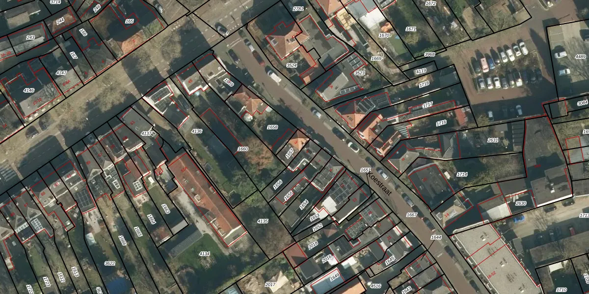 Het perceel waarop Koestraat 3 staat heeft een oppervlakte van 67 m². Dit is een klein perceel. De perceeloppervlakte wordt geregistreerd door het Kadaster. Gedetailleerde informatie over de maten van dit perceel kunt u vinden in het rapport Kadastrale kaart met maatvoering van Koestraat 3.
