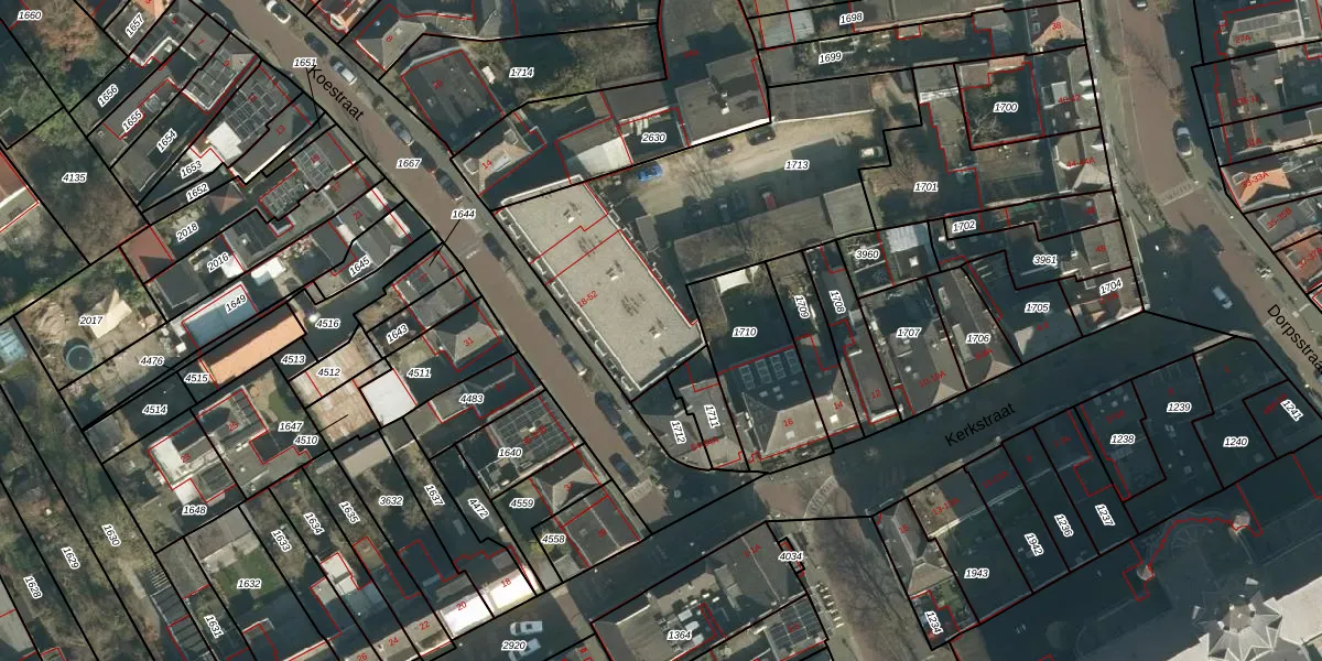 Het perceel waarop Koestraat 50 staat heeft een oppervlakte van 1410 m². Dit is een zeer groot perceel. De perceeloppervlakte wordt geregistreerd door het Kadaster. Gedetailleerde informatie over de maten van dit perceel kunt u vinden in het rapport Kadastrale kaart met maatvoering van Koestraat 50.