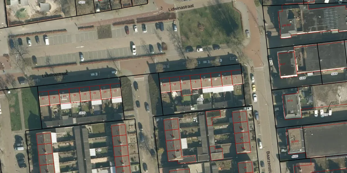 Het perceel waarop Lidwinastraat 13 staat heeft een oppervlakte van 1185 m². Dit is een zeer groot perceel. De perceeloppervlakte wordt geregistreerd door het Kadaster. Gedetailleerde informatie over de maten van dit perceel kunt u vinden in het rapport Kadastrale kaart met maatvoering van Lidwinastraat 13.