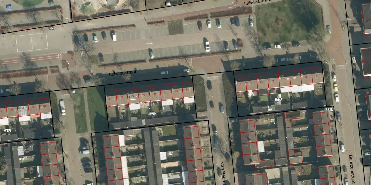 Het perceel waarop Lidwinastraat 17 staat heeft een oppervlakte van 1195 m². Dit is een zeer groot perceel. De perceeloppervlakte wordt geregistreerd door het Kadaster. Gedetailleerde informatie over de maten van dit perceel kunt u vinden in het rapport Kadastrale kaart met maatvoering van Lidwinastraat 17.