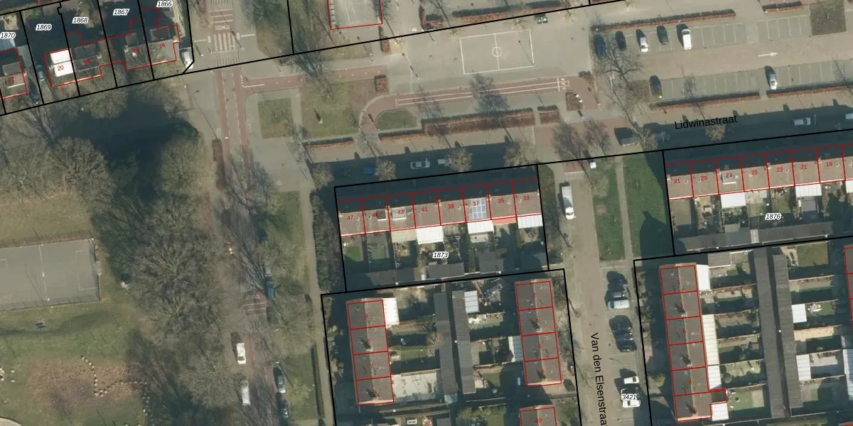 Het perceel waarop Lidwinastraat 41 staat heeft een oppervlakte van 1190 m². Dit is een zeer groot perceel. De perceeloppervlakte wordt geregistreerd door het Kadaster. Gedetailleerde informatie over de maten van dit perceel kunt u vinden in het rapport Kadastrale kaart met maatvoering van Lidwinastraat 41.