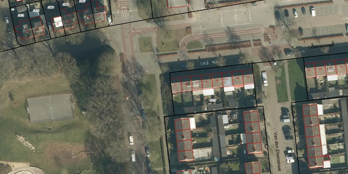 Lidwinastraat 47 is gelegen op kadastraal perceel VUG00D1873. Deze kadastrale aanduiding is uniek en wordt gebruikt door het Kadaster om eigendomsrechten en andere zakelijke rechten vast te leggen. Het perceel maakt onderdeel uit van de kadastrale gemeente Vught.