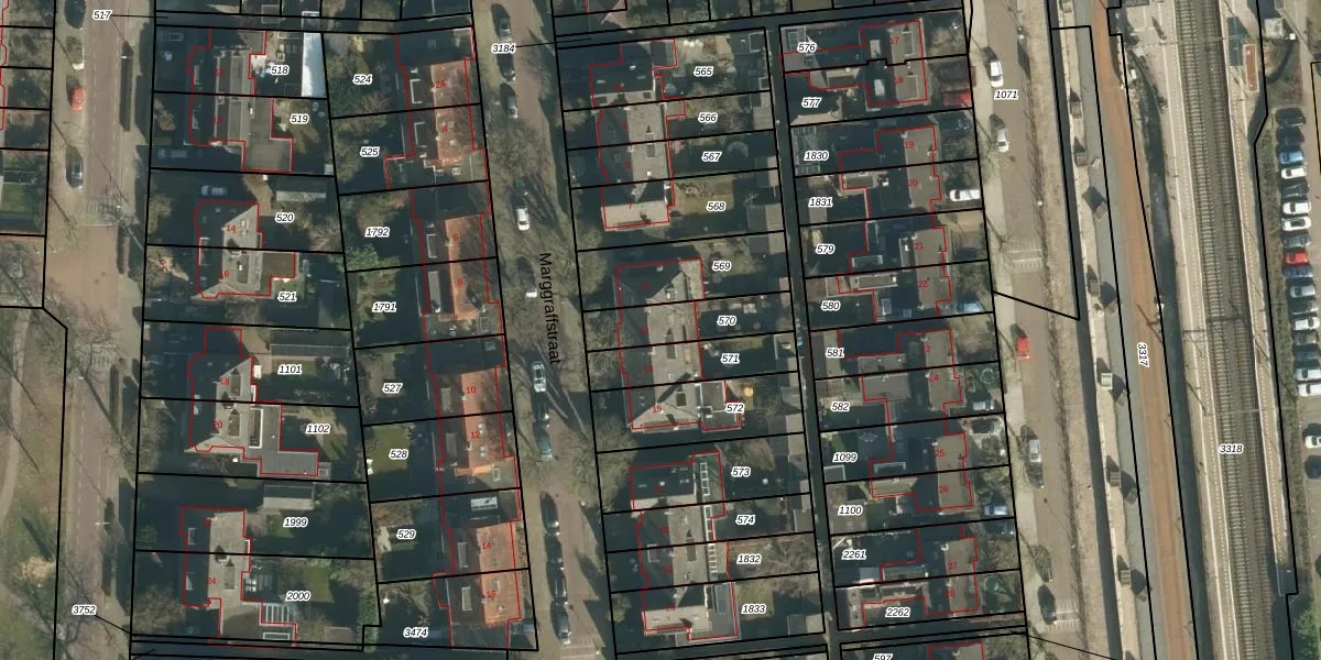 Het perceel waarop Marggraffstraat 11 staat heeft een oppervlakte van 194 m². Dit is een middelgroot perceel. De perceeloppervlakte wordt geregistreerd door het Kadaster. Gedetailleerde informatie over de maten van dit perceel kunt u vinden in het rapport Kadastrale kaart met maatvoering van Marggraffstraat 11.