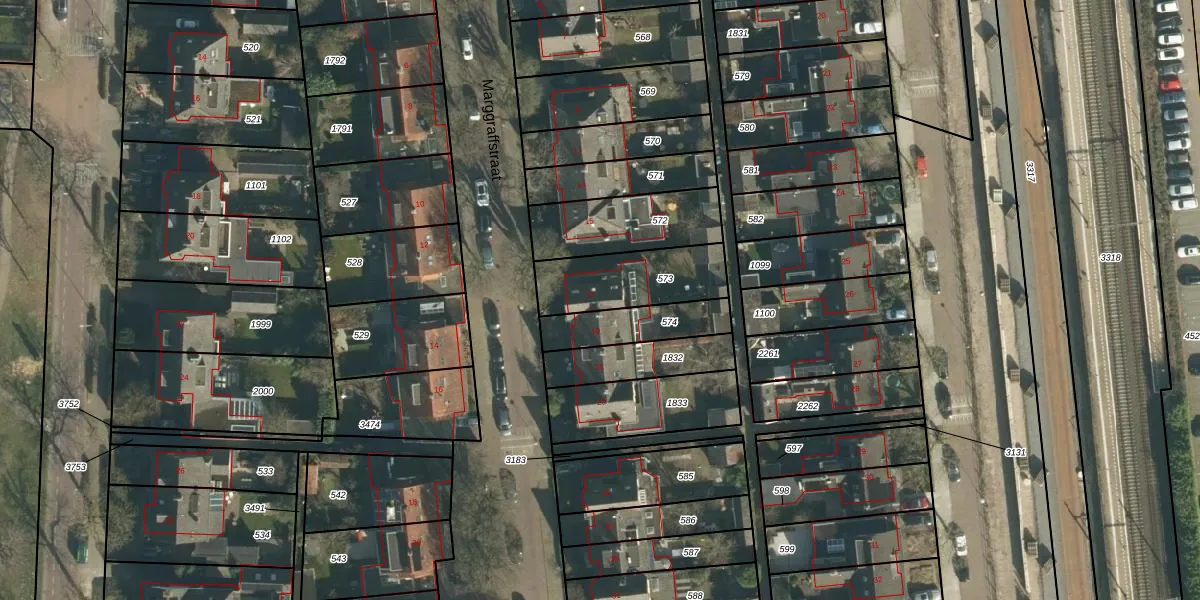 Het perceel waarop Marggraffstraat 17 staat heeft een oppervlakte van 296 m². Dit is een middelgroot perceel. De perceeloppervlakte wordt geregistreerd door het Kadaster. Gedetailleerde informatie over de maten van dit perceel kunt u vinden in het rapport Kadastrale kaart met maatvoering van Marggraffstraat 17.