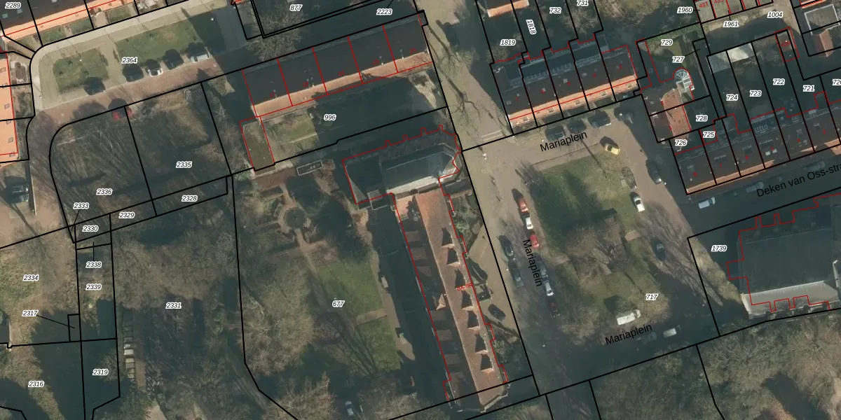 Het perceel waarop Mariaplein 8-K staat heeft een oppervlakte van 3985 m². Dit is een zeer groot perceel. De perceeloppervlakte wordt geregistreerd door het Kadaster. Gedetailleerde informatie over de maten van dit perceel kunt u vinden in het rapport Kadastrale kaart met maatvoering van Mariaplein 8-K.