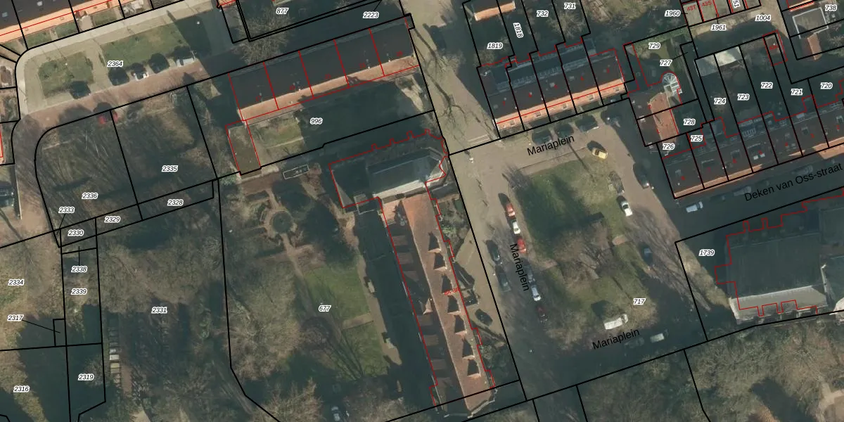 Het perceel waarop Mariaplein 8-C staat heeft een oppervlakte van 3985 m². Dit is een zeer groot perceel. De perceeloppervlakte wordt geregistreerd door het Kadaster. Gedetailleerde informatie over de maten van dit perceel kunt u vinden in het rapport Kadastrale kaart met maatvoering van Mariaplein 8-C.