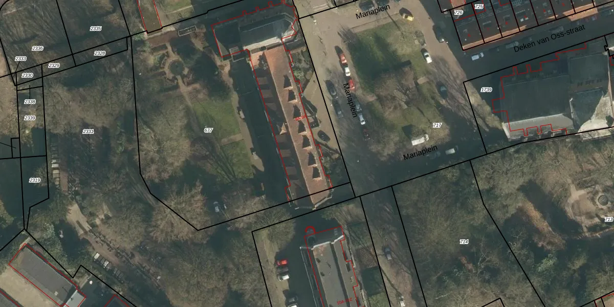 Het perceel waarop Mariaplein 8-E staat heeft een oppervlakte van 3985 m². Dit is een zeer groot perceel. De perceeloppervlakte wordt geregistreerd door het Kadaster. Gedetailleerde informatie over de maten van dit perceel kunt u vinden in het rapport Kadastrale kaart met maatvoering van Mariaplein 8-E.