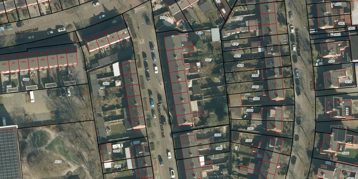 Het perceel waarop Molendwarsstraat 9 staat heeft een oppervlakte van 2466 m². Dit is een zeer groot perceel. De perceeloppervlakte wordt geregistreerd door het Kadaster. Gedetailleerde informatie over de maten van dit perceel kunt u vinden in het rapport Kadastrale kaart met maatvoering van Molendwarsstraat 9.