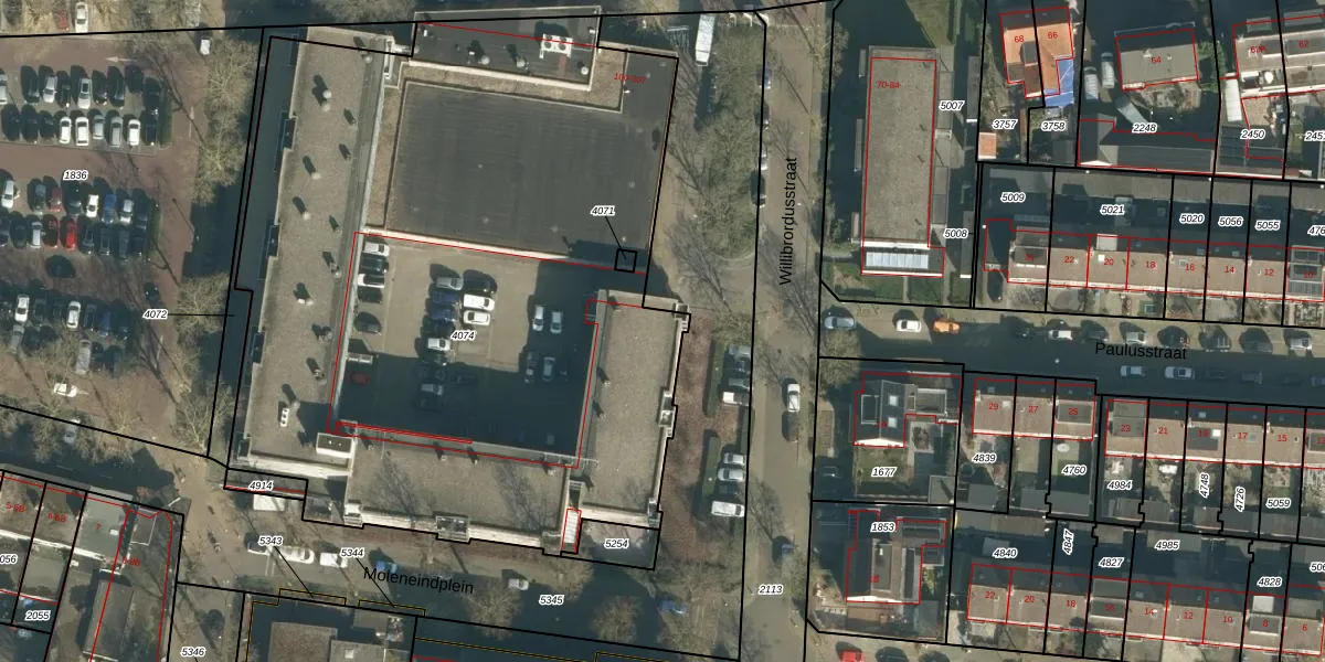 Het perceel waarop Moleneindplein 165 staat heeft een oppervlakte van 4664 m². Dit is een zeer groot perceel. De perceeloppervlakte wordt geregistreerd door het Kadaster. Gedetailleerde informatie over de maten van dit perceel kunt u vinden in het rapport Kadastrale kaart met maatvoering van Moleneindplein 165.