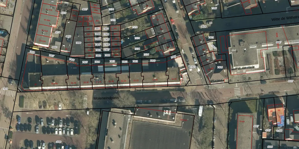 Het perceel waarop Moleneindplein 19 staat heeft een oppervlakte van 328 m². Dit is een groot perceel. De perceeloppervlakte wordt geregistreerd door het Kadaster. Gedetailleerde informatie over de maten van dit perceel kunt u vinden in het rapport Kadastrale kaart met maatvoering van Moleneindplein 19.