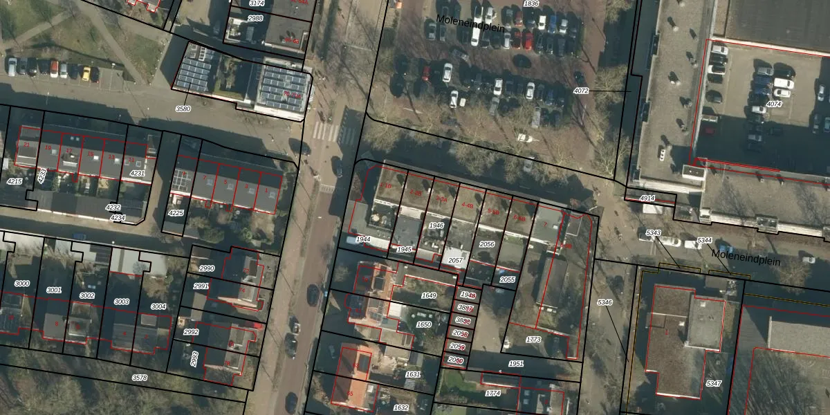 Het perceel waarop Moleneindplein 2 staat heeft een oppervlakte van 142 m². Dit is een middelgroot perceel. De perceeloppervlakte wordt geregistreerd door het Kadaster. Gedetailleerde informatie over de maten van dit perceel kunt u vinden in het rapport Kadastrale kaart met maatvoering van Moleneindplein 2.