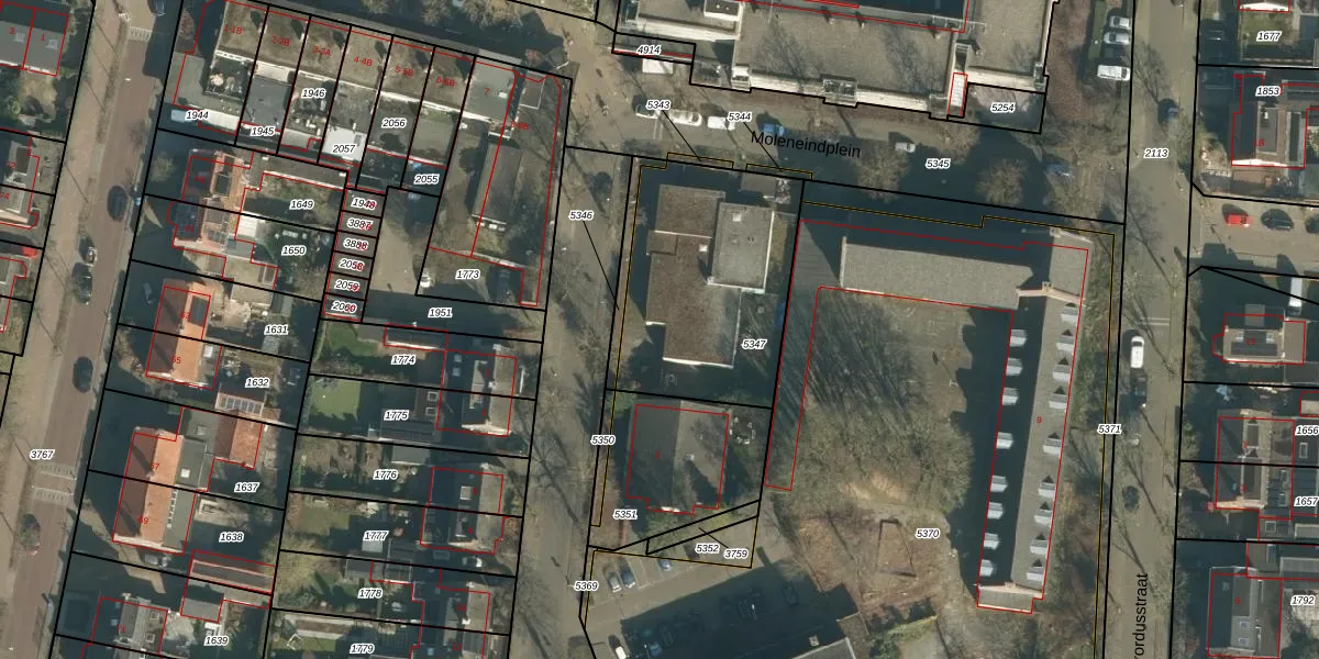 Moleneindstraat 1-A is gelegen op kadastraal perceel VUG00D5347. Deze kadastrale aanduiding is uniek en wordt gebruikt door het Kadaster om eigendomsrechten en andere zakelijke rechten vast te leggen. Het perceel maakt onderdeel uit van de kadastrale gemeente Vught.