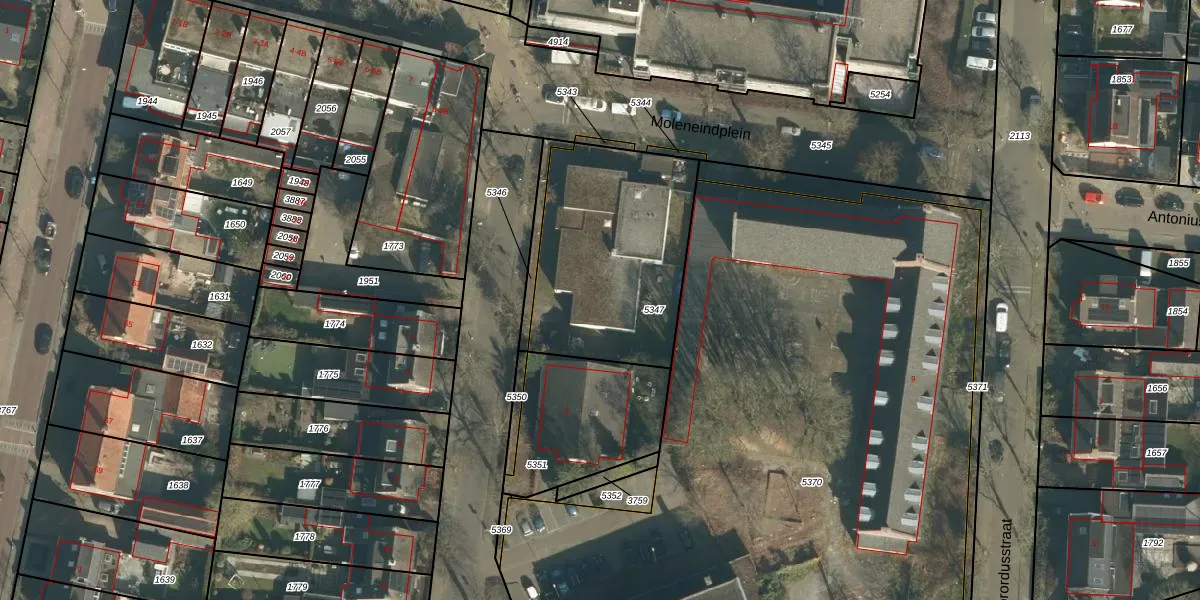 Het perceel waarop Moleneindstraat 1-F staat heeft een oppervlakte van 867 m². Dit is een groot perceel. De perceeloppervlakte wordt geregistreerd door het Kadaster. Gedetailleerde informatie over de maten van dit perceel kunt u vinden in het rapport Kadastrale kaart met maatvoering van Moleneindstraat 1-F.