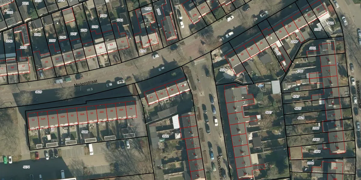 Het perceel waarop Molenstraat 38 staat heeft een oppervlakte van 1870 m². Dit is een zeer groot perceel. De perceeloppervlakte wordt geregistreerd door het Kadaster. Gedetailleerde informatie over de maten van dit perceel kunt u vinden in het rapport Kadastrale kaart met maatvoering van Molenstraat 38.