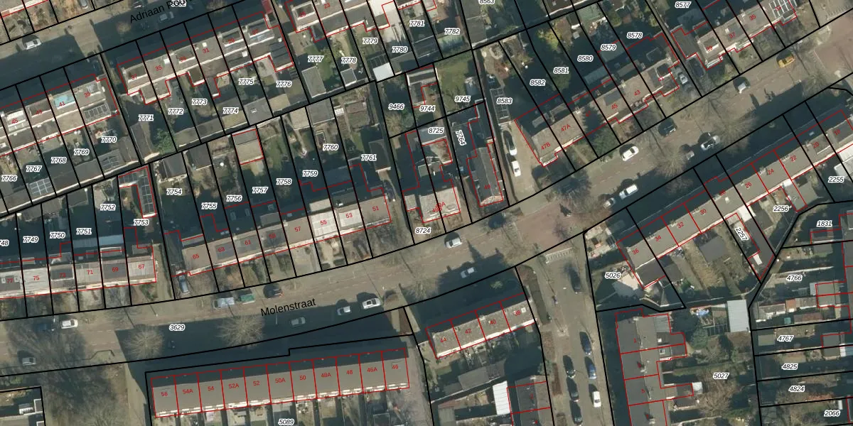 Het perceel waarop Molenstraat 49-B staat heeft een oppervlakte van 188 m². Dit is een middelgroot perceel. De perceeloppervlakte wordt geregistreerd door het Kadaster. Gedetailleerde informatie over de maten van dit perceel kunt u vinden in het rapport Kadastrale kaart met maatvoering van Molenstraat 49-B.