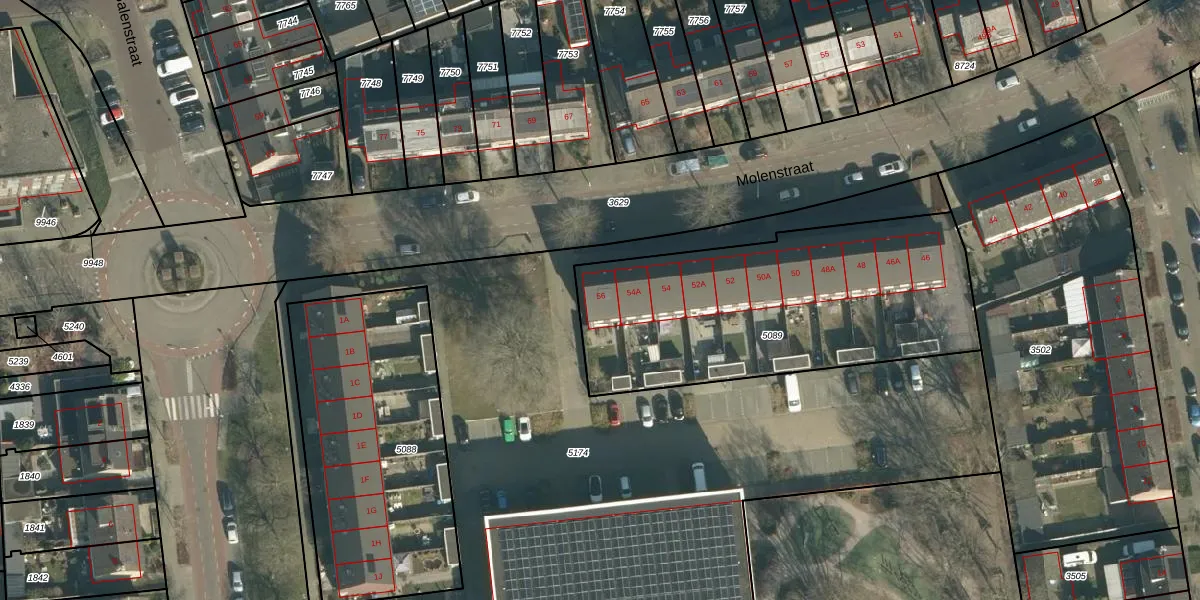 Het perceel waarop Molenstraat 56 staat heeft een oppervlakte van 1480 m². Dit is een zeer groot perceel. De perceeloppervlakte wordt geregistreerd door het Kadaster. Gedetailleerde informatie over de maten van dit perceel kunt u vinden in het rapport Kadastrale kaart met maatvoering van Molenstraat 56.
