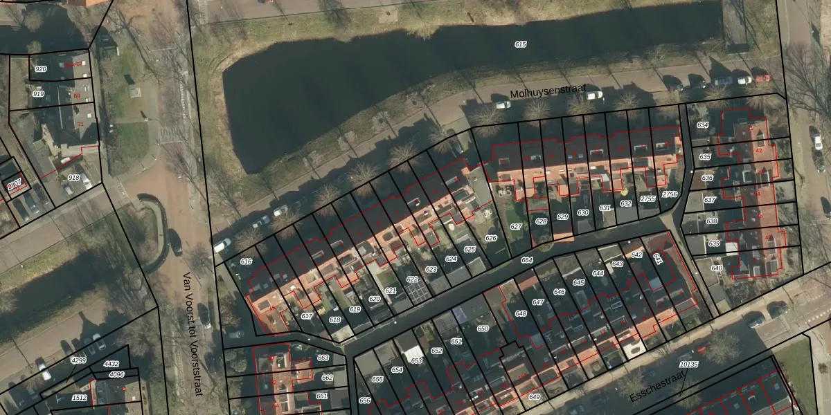 Molhuysenstraat 8 is gelegen op kadastraal perceel VUG00L624. Deze kadastrale aanduiding is uniek en wordt gebruikt door het Kadaster om eigendomsrechten en andere zakelijke rechten vast te leggen. Het perceel maakt onderdeel uit van de kadastrale gemeente Vught.