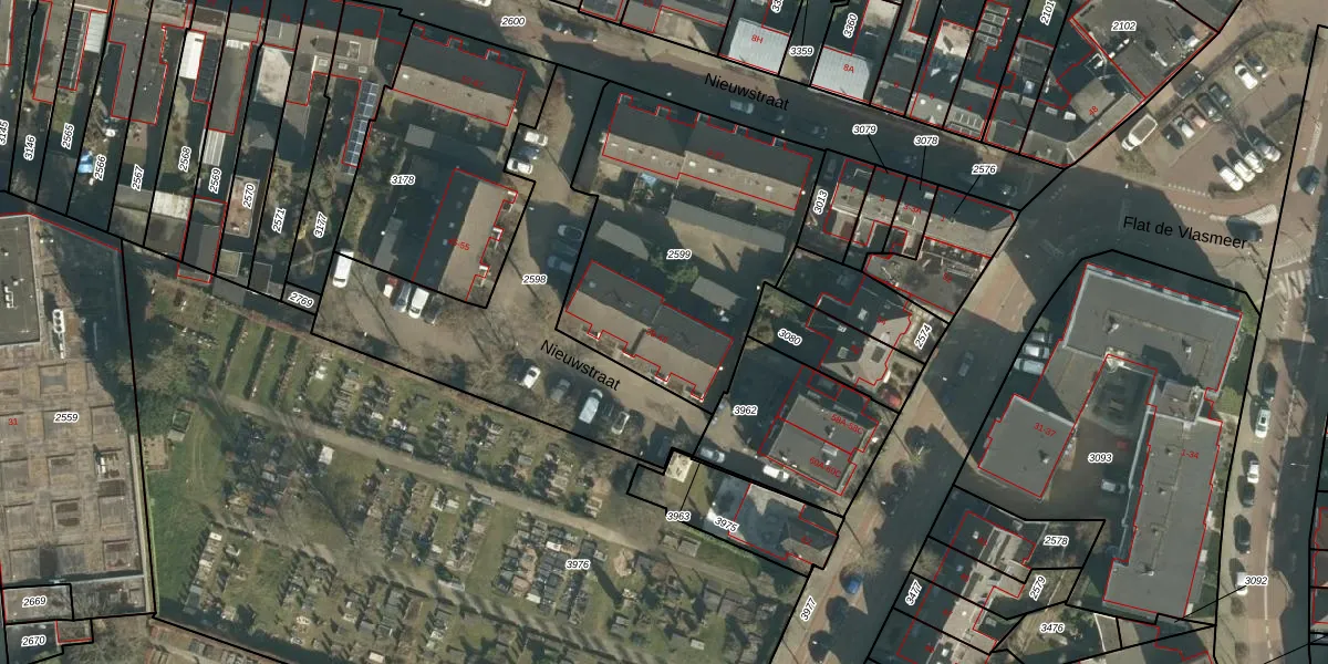 Het perceel waarop Nieuwstraat 39 staat heeft een oppervlakte van 1245 m². Dit is een zeer groot perceel. De perceeloppervlakte wordt geregistreerd door het Kadaster. Gedetailleerde informatie over de maten van dit perceel kunt u vinden in het rapport Kadastrale kaart met maatvoering van Nieuwstraat 39.