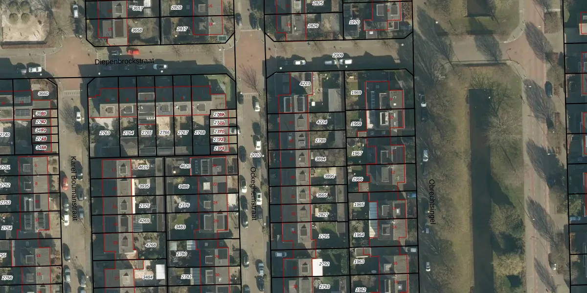 Gebruik de zoekbalk of klik op een perceel voor informatie over de adressen binnen dit perceel.