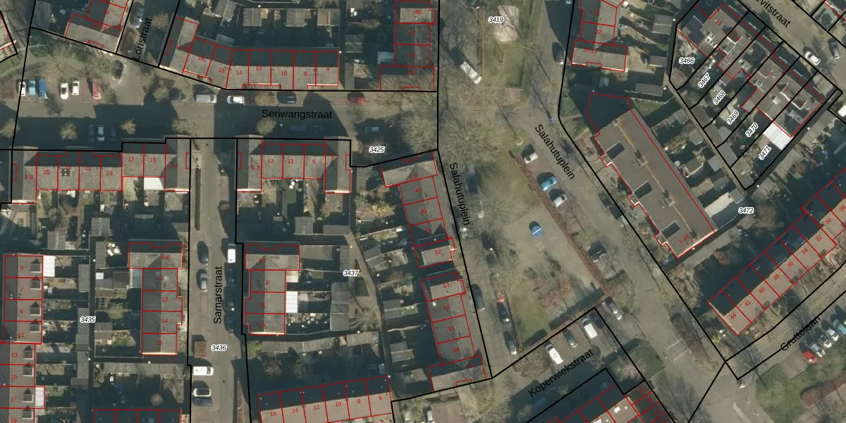 Het perceel waarop Salahutuplein 50 staat heeft een oppervlakte van 3416 m². Dit is een zeer groot perceel. De perceeloppervlakte wordt geregistreerd door het Kadaster. Gedetailleerde informatie over de maten van dit perceel kunt u vinden in het rapport Kadastrale kaart met maatvoering van Salahutuplein 50.