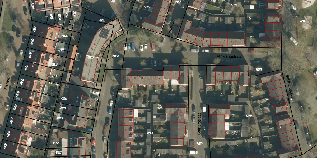 Het perceel waarop Seriwangstraat 19 staat heeft een oppervlakte van 3517 m². Dit is een zeer groot perceel. De perceeloppervlakte wordt geregistreerd door het Kadaster. Gedetailleerde informatie over de maten van dit perceel kunt u vinden in het rapport Kadastrale kaart met maatvoering van Seriwangstraat 19.