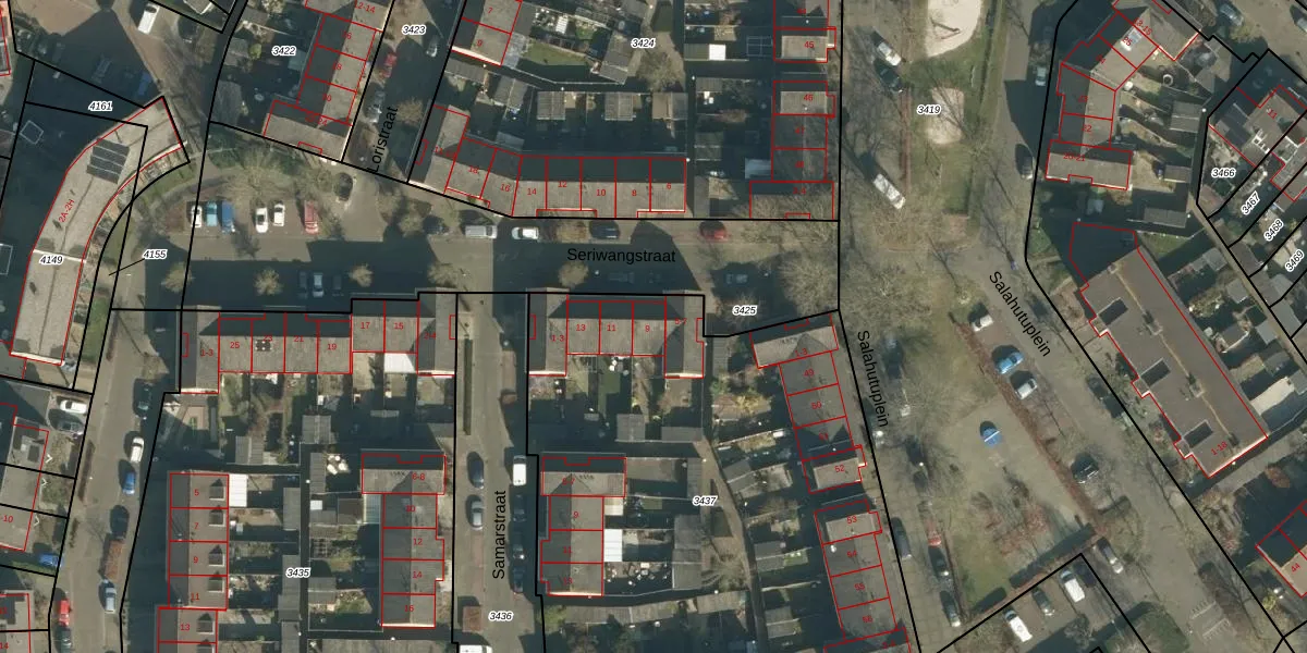 Het perceel waarop Seriwangstraat 9 staat heeft een oppervlakte van 3416 m². Dit is een zeer groot perceel. De perceeloppervlakte wordt geregistreerd door het Kadaster. Gedetailleerde informatie over de maten van dit perceel kunt u vinden in het rapport Kadastrale kaart met maatvoering van Seriwangstraat 9.