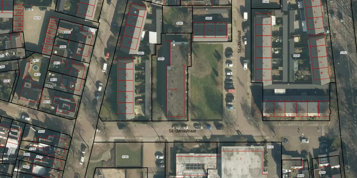 Het perceel waarop St.-Jansstraat 24 staat heeft een oppervlakte van 987 m². Dit is een groot perceel. De perceeloppervlakte wordt geregistreerd door het Kadaster. Gedetailleerde informatie over de maten van dit perceel kunt u vinden in het rapport Kadastrale kaart met maatvoering van St.-Jansstraat 24.