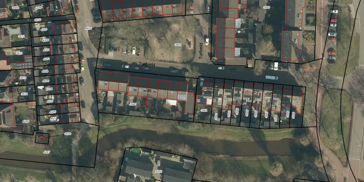 Turfveld 11 is gelegen op kadastraal perceel VUG00D3580. Deze kadastrale aanduiding is uniek en wordt gebruikt door het Kadaster om eigendomsrechten en andere zakelijke rechten vast te leggen. Het perceel maakt onderdeel uit van de kadastrale gemeente Vught.