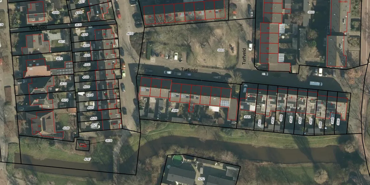 Het perceel waarop Turfveld 15 staat heeft een oppervlakte van 1311 m². Dit is een zeer groot perceel. De perceeloppervlakte wordt geregistreerd door het Kadaster. Gedetailleerde informatie over de maten van dit perceel kunt u vinden in het rapport Kadastrale kaart met maatvoering van Turfveld 15.