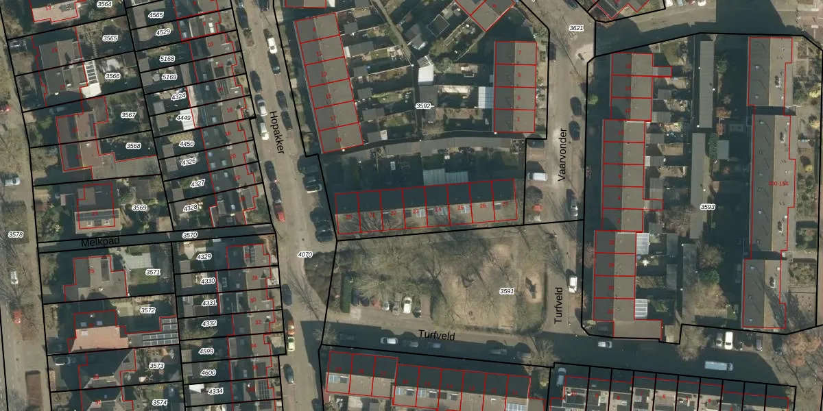 Het perceel waarop Turfveld 23 staat heeft een oppervlakte van 4321 m². Dit is een zeer groot perceel. De perceeloppervlakte wordt geregistreerd door het Kadaster. Gedetailleerde informatie over de maten van dit perceel kunt u vinden in het rapport Kadastrale kaart met maatvoering van Turfveld 23.
