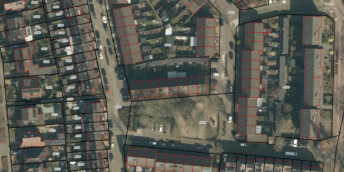 Het perceel waarop Turfveld 24 staat heeft een oppervlakte van 4321 m². Dit is een zeer groot perceel. De perceeloppervlakte wordt geregistreerd door het Kadaster. Gedetailleerde informatie over de maten van dit perceel kunt u vinden in het rapport Kadastrale kaart met maatvoering van Turfveld 24.