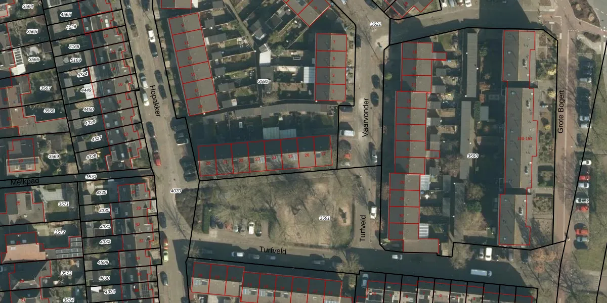 Het perceel waarop Turfveld 26 staat heeft een oppervlakte van 4321 m². Dit is een zeer groot perceel. De perceeloppervlakte wordt geregistreerd door het Kadaster. Gedetailleerde informatie over de maten van dit perceel kunt u vinden in het rapport Kadastrale kaart met maatvoering van Turfveld 26.