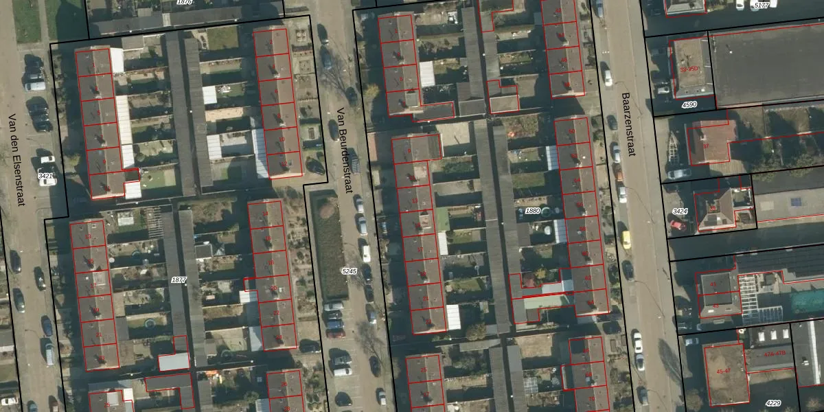 Het perceel waarop Van Beurdenstraat 13 staat heeft een oppervlakte van 6440 m². Dit is een zeer groot perceel. De perceeloppervlakte wordt geregistreerd door het Kadaster. Gedetailleerde informatie over de maten van dit perceel kunt u vinden in het rapport Kadastrale kaart met maatvoering van Van Beurdenstraat 13.