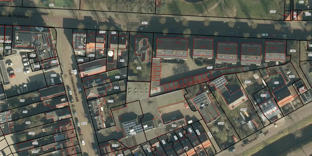 Het perceel waarop Van de Pollstraat 23-D staat heeft een oppervlakte van 2375 m². Dit is een zeer groot perceel. De perceeloppervlakte wordt geregistreerd door het Kadaster. Gedetailleerde informatie over de maten van dit perceel kunt u vinden in het rapport Kadastrale kaart met maatvoering van Van de Pollstraat 23-D.