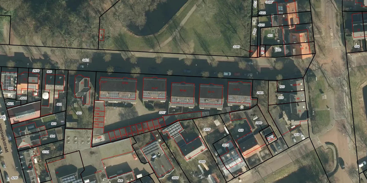 Het perceel waarop Van de Pollstraat 55 staat heeft een oppervlakte van 2375 m². Dit is een zeer groot perceel. De perceeloppervlakte wordt geregistreerd door het Kadaster. Gedetailleerde informatie over de maten van dit perceel kunt u vinden in het rapport Kadastrale kaart met maatvoering van Van de Pollstraat 55.