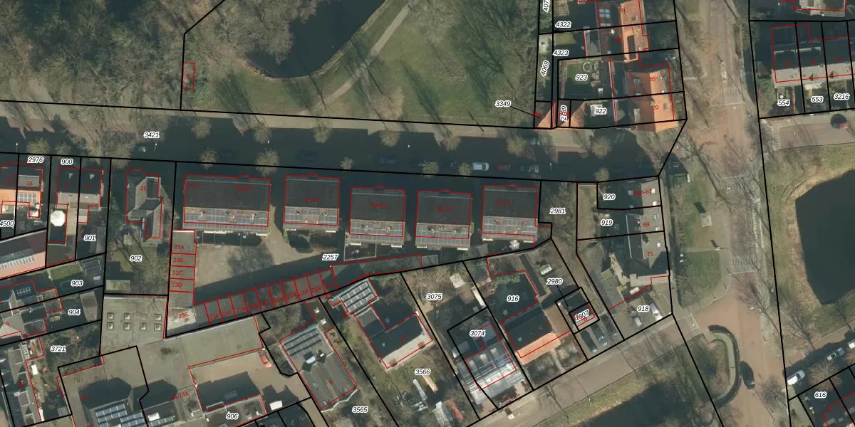 Het perceel waarop Van de Pollstraat 65 staat heeft een oppervlakte van 2375 m². Dit is een zeer groot perceel. De perceeloppervlakte wordt geregistreerd door het Kadaster. Gedetailleerde informatie over de maten van dit perceel kunt u vinden in het rapport Kadastrale kaart met maatvoering van Van de Pollstraat 65.