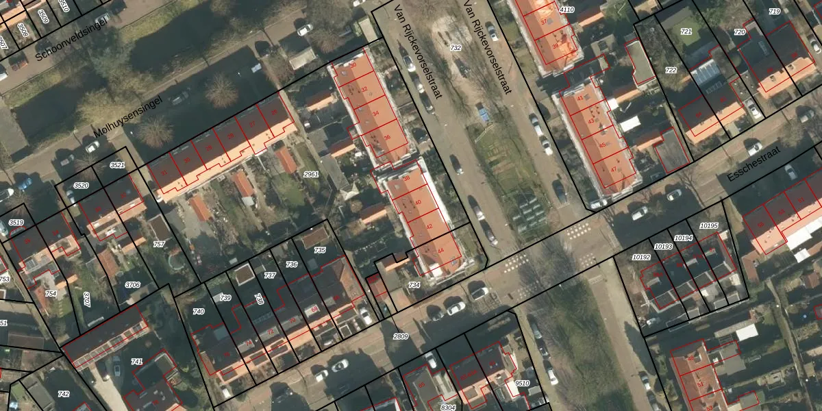 Van Rijckevorselstraat 40 is gelegen op kadastraal perceel VUG00L2961. Deze kadastrale aanduiding is uniek en wordt gebruikt door het Kadaster om eigendomsrechten en andere zakelijke rechten vast te leggen. Het perceel maakt onderdeel uit van de kadastrale gemeente Vught.