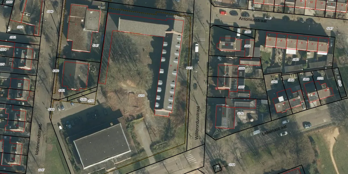 Het perceel waarop Willibrordusstraat 12 staat heeft een oppervlakte van 5264 m². Dit is een zeer groot perceel. De perceeloppervlakte wordt geregistreerd door het Kadaster. Gedetailleerde informatie over de maten van dit perceel kunt u vinden in het rapport Kadastrale kaart met maatvoering van Willibrordusstraat 12.