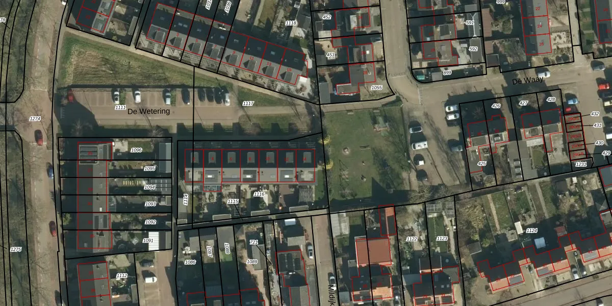 Het perceel waarop De Wetering 14 staat heeft een oppervlakte van 1082 m². Dit is een zeer groot perceel. De perceeloppervlakte wordt geregistreerd door het Kadaster. Gedetailleerde informatie over de maten van dit perceel kunt u vinden in het rapport Kadastrale kaart met maatvoering van De Wetering 14.
