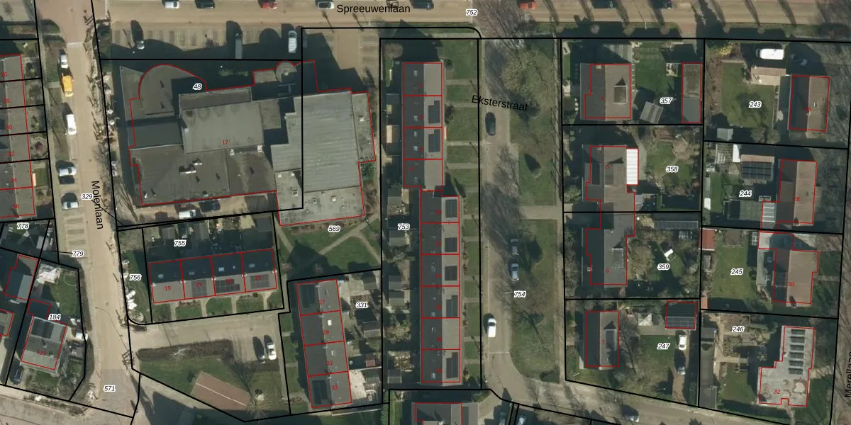Het perceel waarop Eksterstraat 10 staat heeft een oppervlakte van 1910 m². Dit is een zeer groot perceel. De perceeloppervlakte wordt geregistreerd door het Kadaster. Gedetailleerde informatie over de maten van dit perceel kunt u vinden in het rapport Kadastrale kaart met maatvoering van Eksterstraat 10.