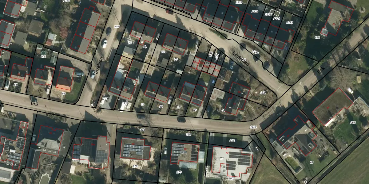 Het perceel waarop Enk 53 staat heeft een oppervlakte van 351 m². Dit is een groot perceel. De perceeloppervlakte wordt geregistreerd door het Kadaster. Gedetailleerde informatie over de maten van dit perceel kunt u vinden in het rapport Kadastrale kaart met maatvoering van Enk 53.