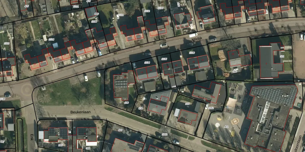 Het perceel waarop Mildijk 16 staat heeft een oppervlakte van 385 m². Dit is een groot perceel. De perceeloppervlakte wordt geregistreerd door het Kadaster. Gedetailleerde informatie over de maten van dit perceel kunt u vinden in het rapport Kadastrale kaart met maatvoering van Mildijk 16.