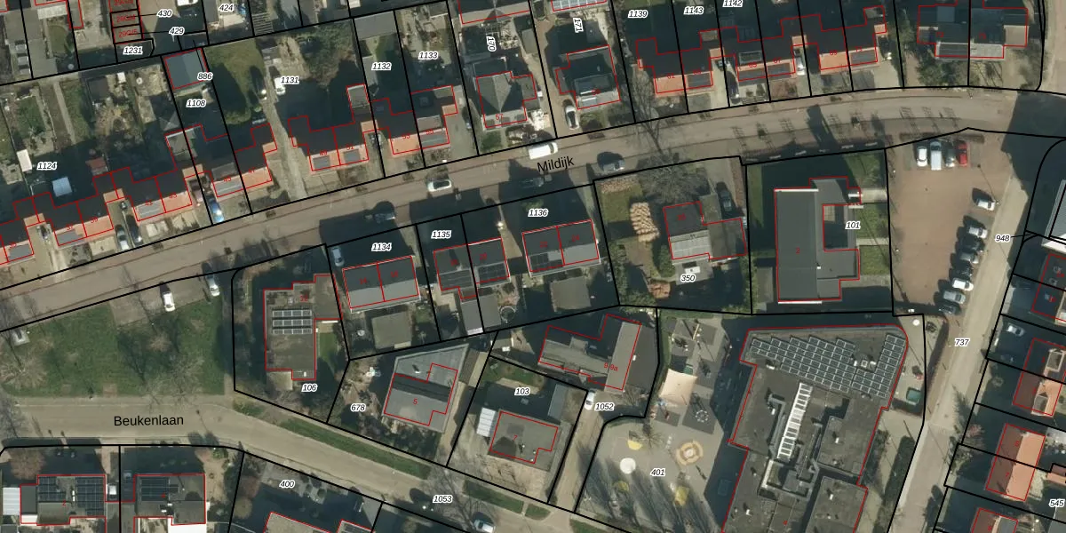 Het perceel waarop Mildijk 22 staat heeft een oppervlakte van 596 m². Dit is een groot perceel. De perceeloppervlakte wordt geregistreerd door het Kadaster. Gedetailleerde informatie over de maten van dit perceel kunt u vinden in het rapport Kadastrale kaart met maatvoering van Mildijk 22.