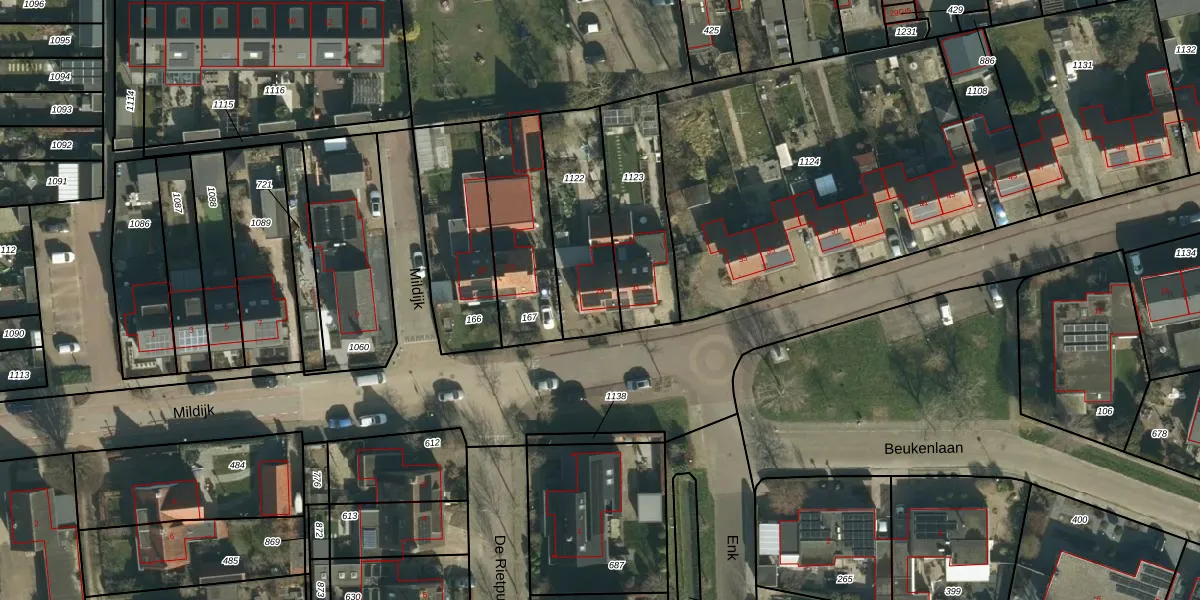 Het perceel waarop Mildijk 29 staat heeft een oppervlakte van 375 m². Dit is een groot perceel. De perceeloppervlakte wordt geregistreerd door het Kadaster. Gedetailleerde informatie over de maten van dit perceel kunt u vinden in het rapport Kadastrale kaart met maatvoering van Mildijk 29.