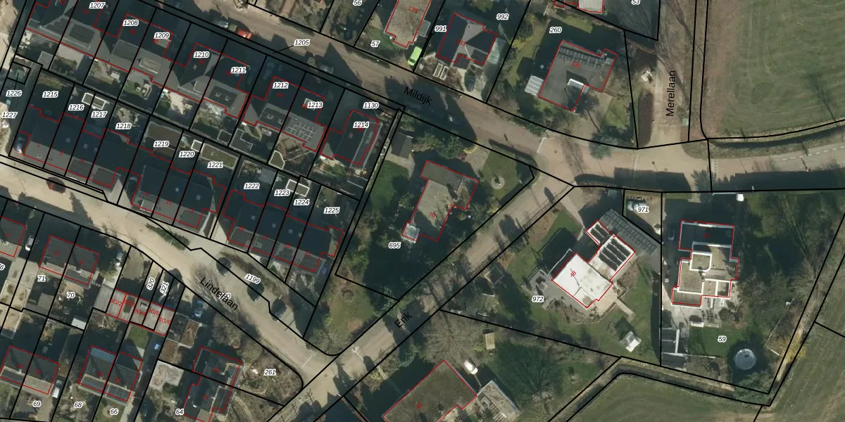 Het perceel waarop Mildijk 70 staat heeft een oppervlakte van 1080 m². Dit is een zeer groot perceel. De perceeloppervlakte wordt geregistreerd door het Kadaster. Gedetailleerde informatie over de maten van dit perceel kunt u vinden in het rapport Kadastrale kaart met maatvoering van Mildijk 70.