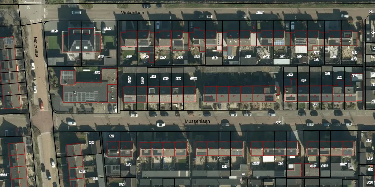 Het perceel waarop Mussenlaan 11 staat heeft een oppervlakte van 1279 m². Dit is een zeer groot perceel. De perceeloppervlakte wordt geregistreerd door het Kadaster. Gedetailleerde informatie over de maten van dit perceel kunt u vinden in het rapport Kadastrale kaart met maatvoering van Mussenlaan 11.