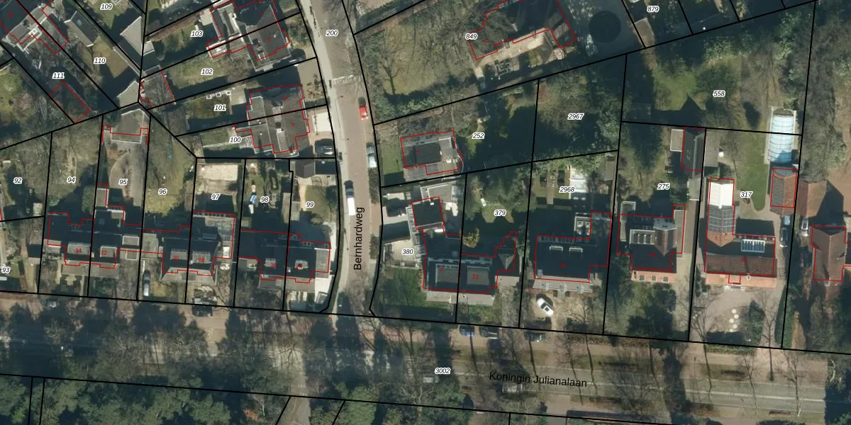 Het perceel waarop Bernhardweg 2 staat heeft een oppervlakte van 640 m². Dit is een groot perceel. De perceeloppervlakte wordt geregistreerd door het Kadaster. Gedetailleerde informatie over de maten van dit perceel kunt u vinden in het rapport Kadastrale kaart met maatvoering van Bernhardweg 2.