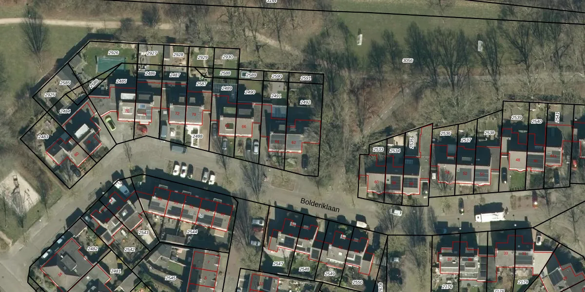 Het perceel waarop Bolderiklaan 62 staat heeft een oppervlakte van 362 m². Dit is een groot perceel. De perceeloppervlakte wordt geregistreerd door het Kadaster. Gedetailleerde informatie over de maten van dit perceel kunt u vinden in het rapport Kadastrale kaart met maatvoering van Bolderiklaan 62.