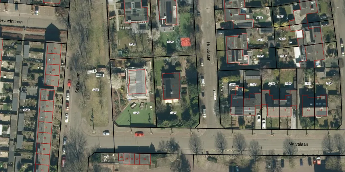 Het perceel waarop Hostalaan 1 staat heeft een oppervlakte van 1050 m². Dit is een zeer groot perceel. De perceeloppervlakte wordt geregistreerd door het Kadaster. Gedetailleerde informatie over de maten van dit perceel kunt u vinden in het rapport Kadastrale kaart met maatvoering van Hostalaan 1.