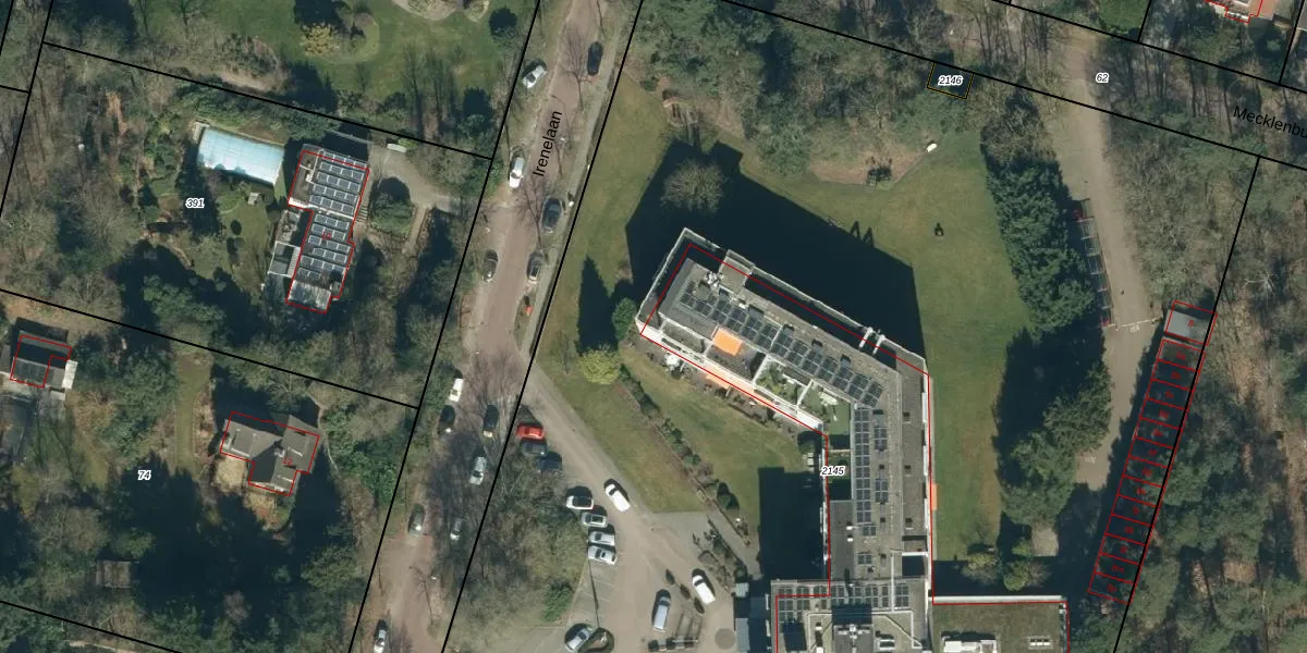 Het perceel waarop Irenelaan 9-b-2 staat heeft een oppervlakte van 1,6 ha. Dit is een zeer groot perceel. De perceeloppervlakte wordt geregistreerd door het Kadaster. Gedetailleerde informatie over de maten van dit perceel kunt u vinden in het rapport Kadastrale kaart met maatvoering van Irenelaan 9-b-2.